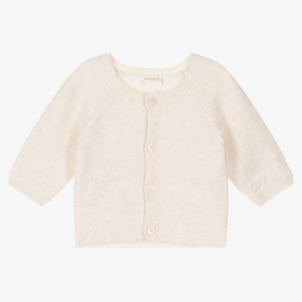 Beige knitted cardigan for baby boys by Spanish brand Mayoral. Soft and comfortable, it is made in a warm cotton and wool blend. It has pretty stitch detailing, faux front pockets, ribbed trims and front button fastenings.