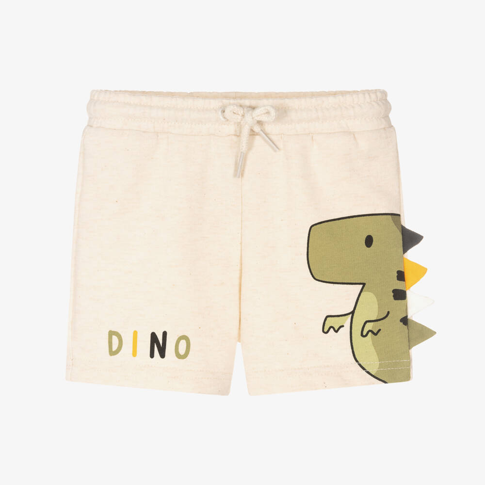 Playful beige shorts for baby boys by Spanish brand Mayoral, made in the softest cotton jersey. They have a dinosaur printed with the words 'DINO' on the front, and spike appliqués on the side. Designed for comfort, they have an elasticated drawstring waistband and a pocket on the back with footprints.