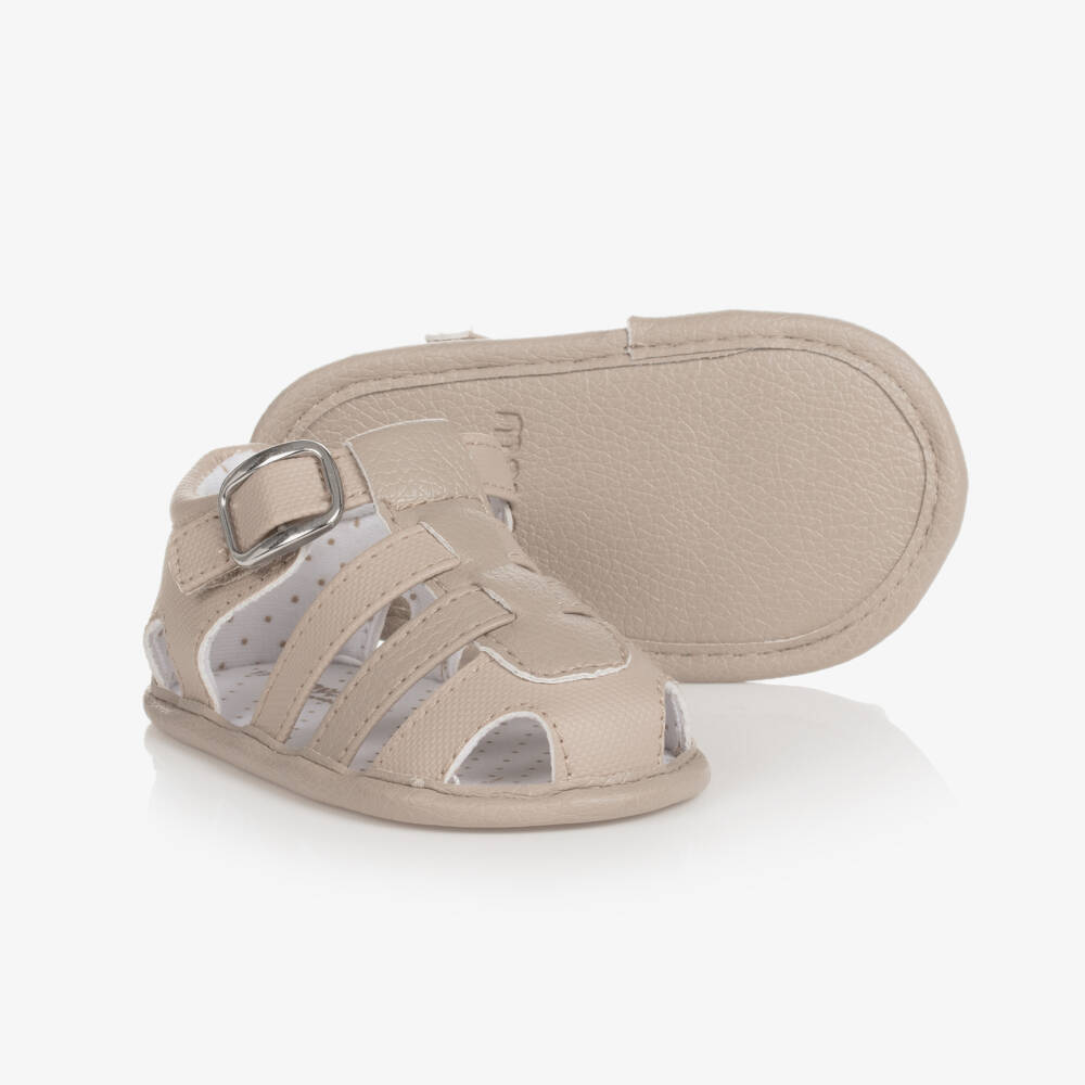 Beige pre-walker sandals for baby boys by Mayoral, made in soft faux leather. Lined in soft cotton for comfort, these sweet shoes secure on the foot with an easy fastening velcro strap.