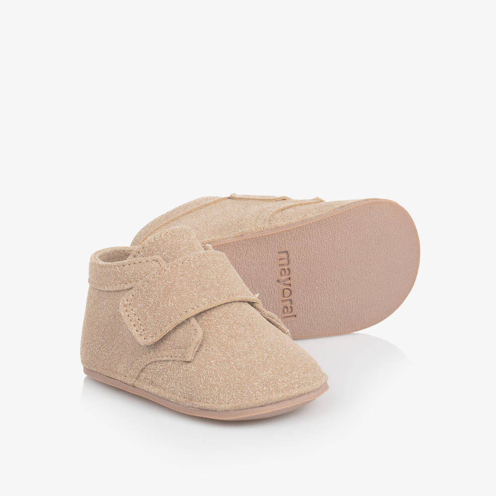 Beige pre-walker shoes for baby boys by Mayoral. Simply styled, they are made from smooth faux suede leather with a soft cotton lining and a brown non-slip flexible rubber outsole for better grip. They fasten with velcro straps across the front to make dressing easier.