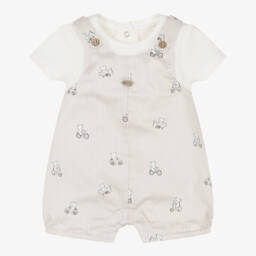 Pack of two yellow and blue shorties for baby boys, by Mayoral. Made in soft and sustainable cotton jersey, they each have useful poppers on the shoulders, the sides and between the legs to make dressing easier. One is plain yellow and the other is blue and white striped, and they both have adorable beige puppy prints.