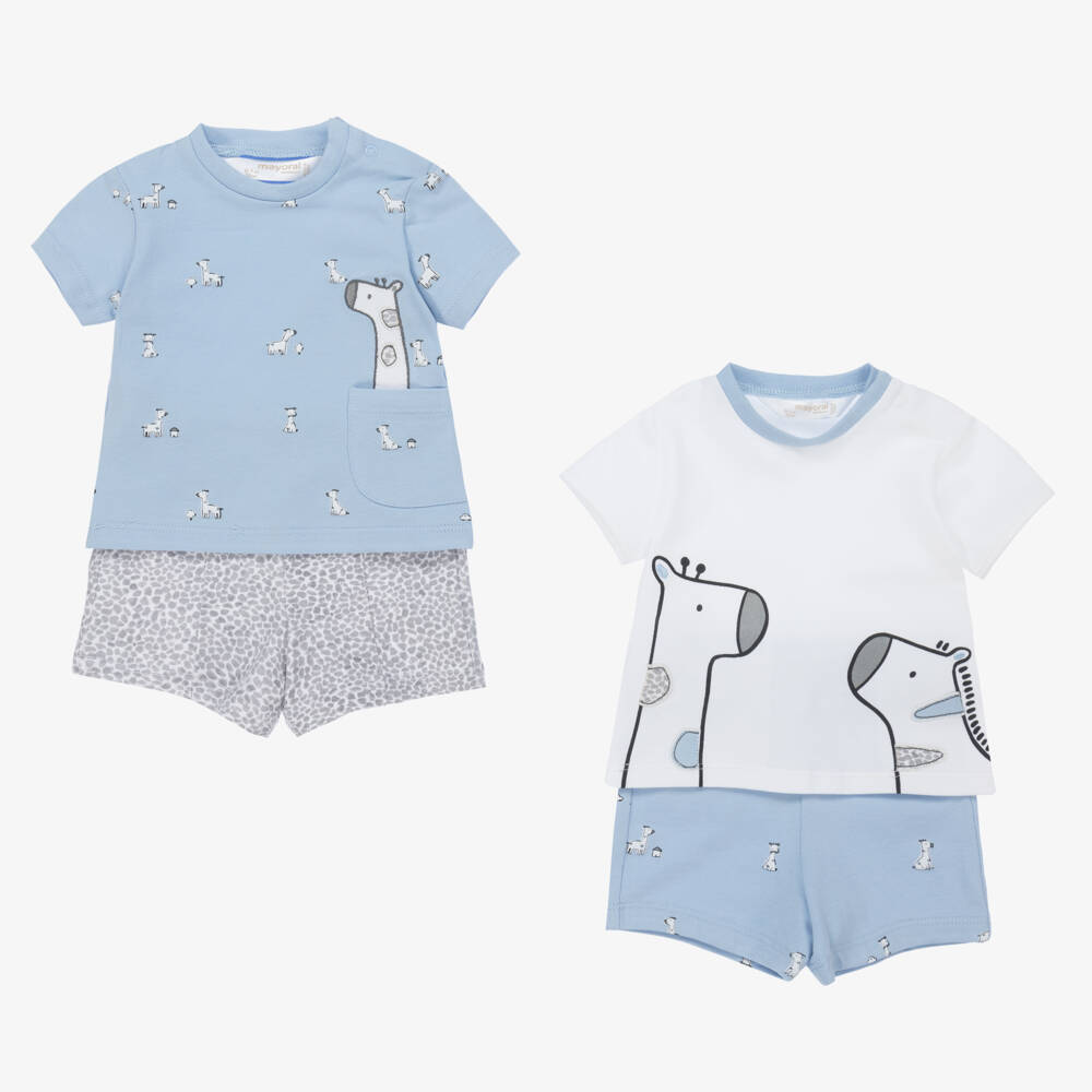 Pack of two blue shorts sets for baby boys by Mayoral, made in soft sustainable cotton jersey. One outfit has a cute giraffe and zebra appliqué on the front of the T-shirt and cute blue shorts with an animal print all-over. The other outfit has matching animal prints on the T-shirt, and matching grey giraffe print shorts. Both T-shirts fasten with poppers on one shoulder for ease when dressing. Mix and match each piece for versatile looks.