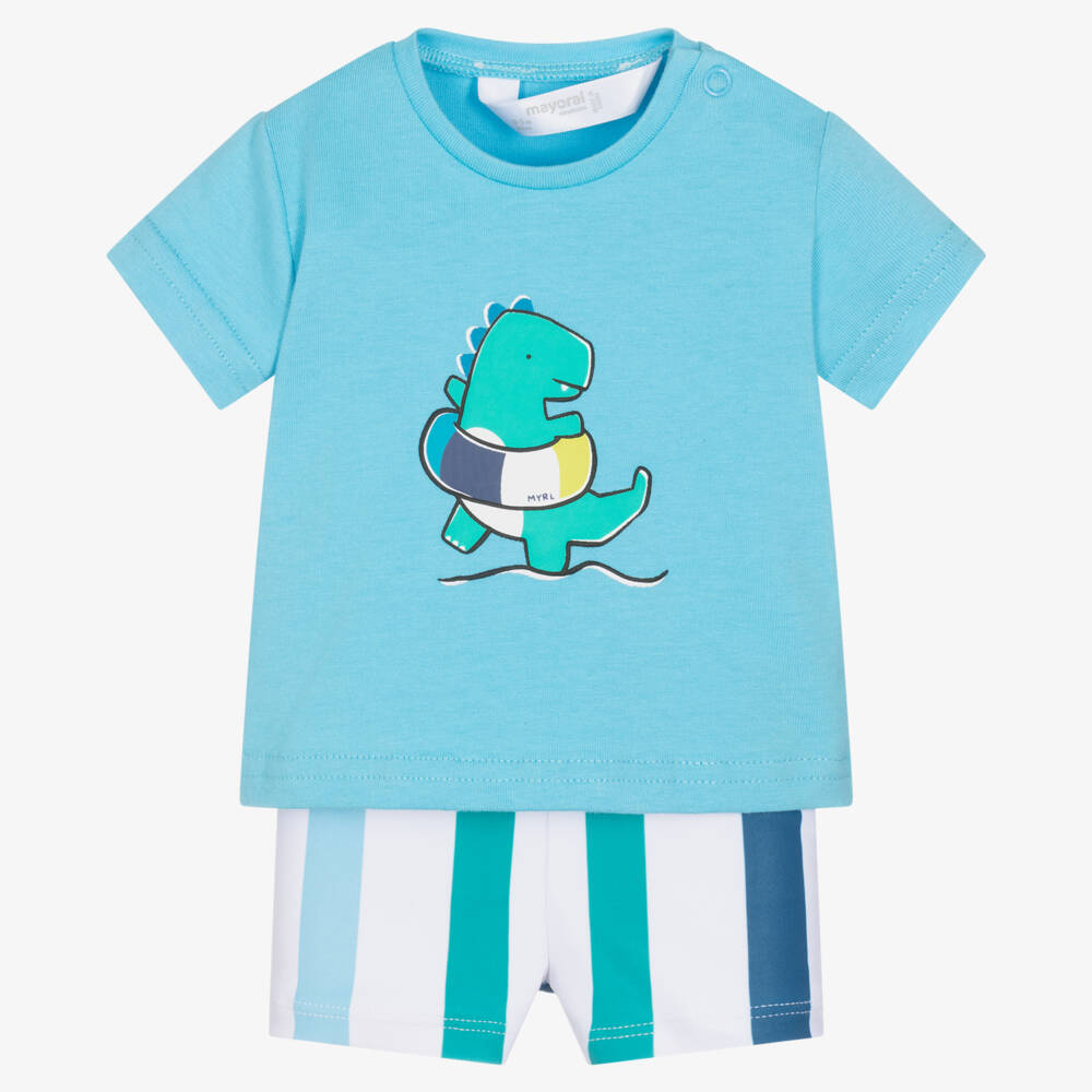 Sky blue and white swim shorts set for baby boys from Mayoral. Stretchy and comfortable, the cotton jersey T-shirt has a dinosaur print on the front and easy-to-fasten shoulder poppers for quick dressing. Ideal as beachwear, the set includes stripy white and blue silky lycra swim shorts, with a softly elasticated waist, faux drawstring and a cute dinosaur appliqué on the back.