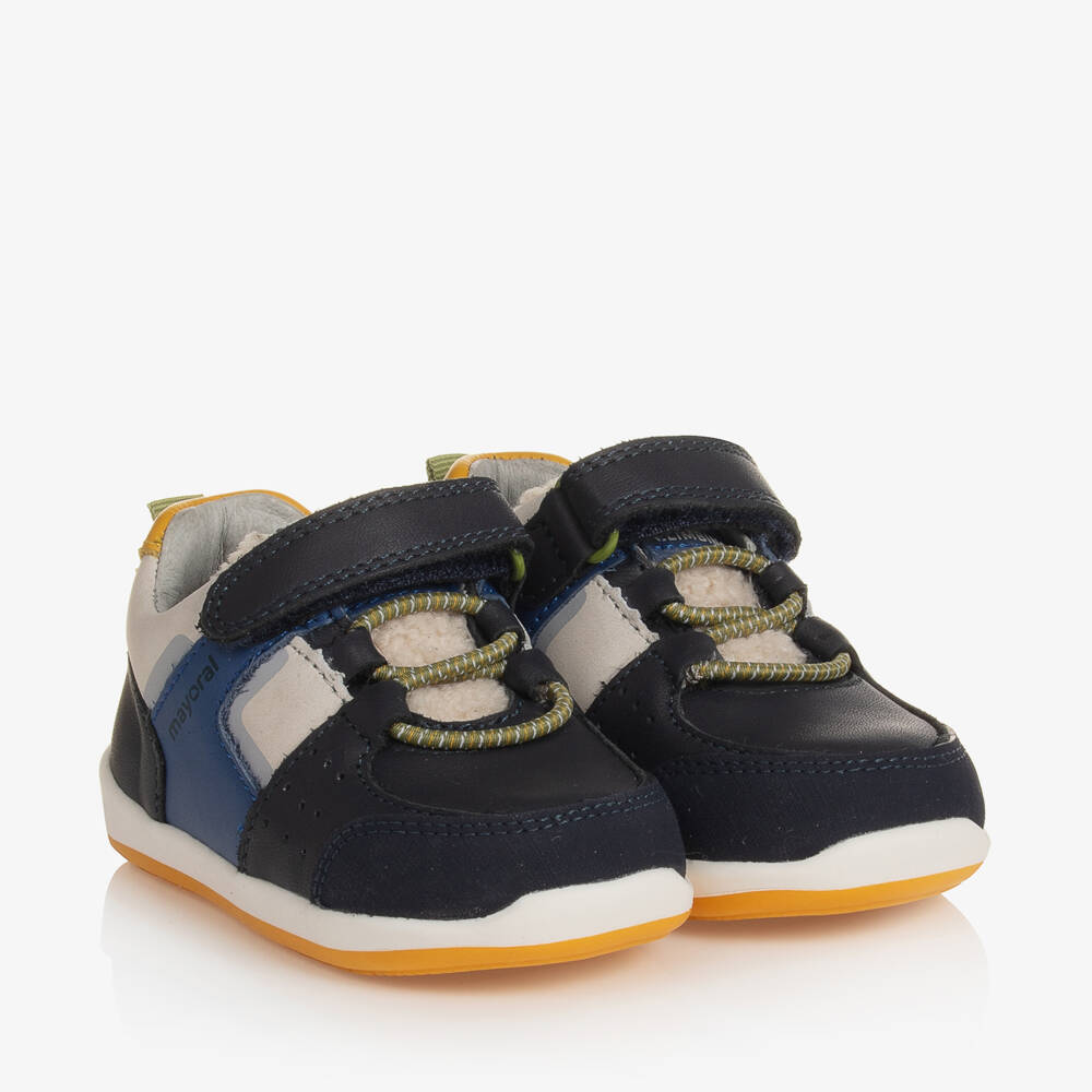 Navy blue leather first walker trainers for baby boys by Mayoral. Super cool, they have blue and yellow trims and a faux sherpa fleece tongue with a fun logo patch. There is green bungee-cord style elastic across the toes and they fasten with a practical velcro strap for easy wear. Lined in soft leather, they have removable insoles and flexible non-slip rubber outsoles for good grip. For extra support, the heels and rounded toes are reinforced, and they have padded ankle cuffs for extra comfort when walking. These shoes are made with sustainable tanned leather.