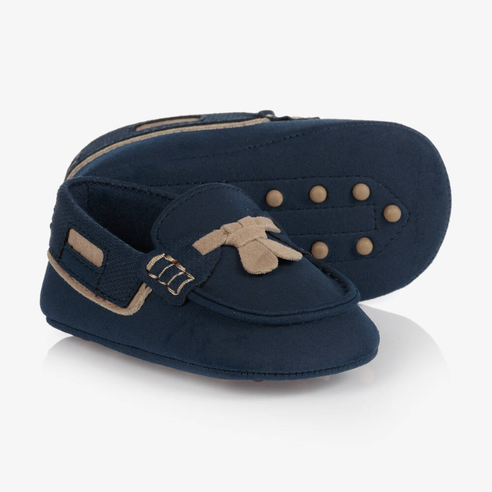 Charming navy blue slip-on moccasin shoes for baby boys by Mayoral Newborn. Made in soft faux suede, they have a cute tie detail on the front and small rubberised pebble grip on the outer sole for improved stability.