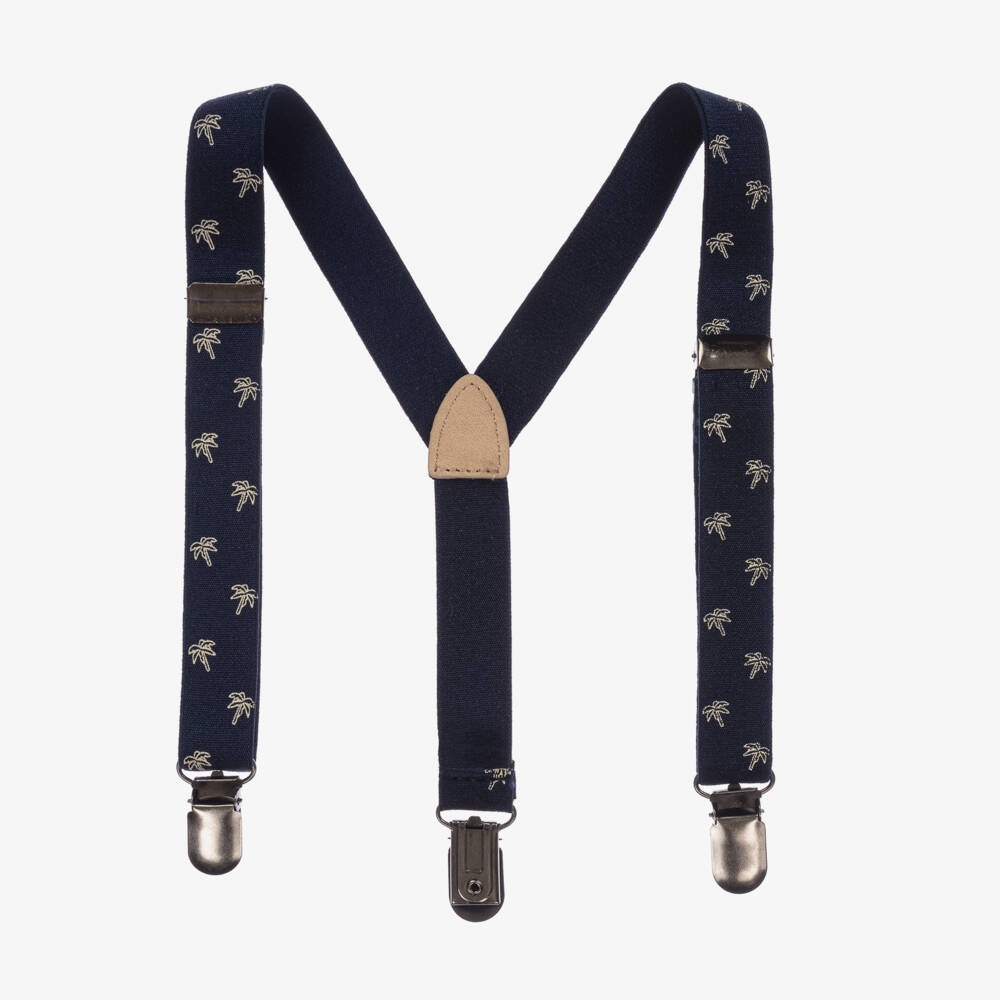 Navy blue braces for baby boys from Spanish designer Mayoral, with a fun beige palm tree print. These super-stretchy braces are adjustable for a great fit, and attach to trousers or shorts with sturdy pewter-coloured metal clips.