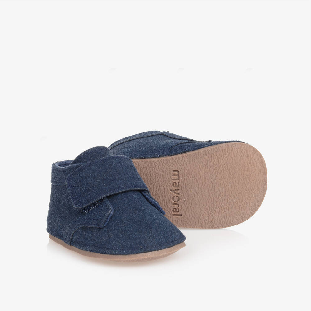 Navy blue pre-walker shoes for baby boys by Mayoral. Simply styled, they are made from smooth faux suede leather with a soft cotton lining and a brown non-slip flexible rubber outsole for better grip. They fasten with velcro straps across the front to make dressing easier.