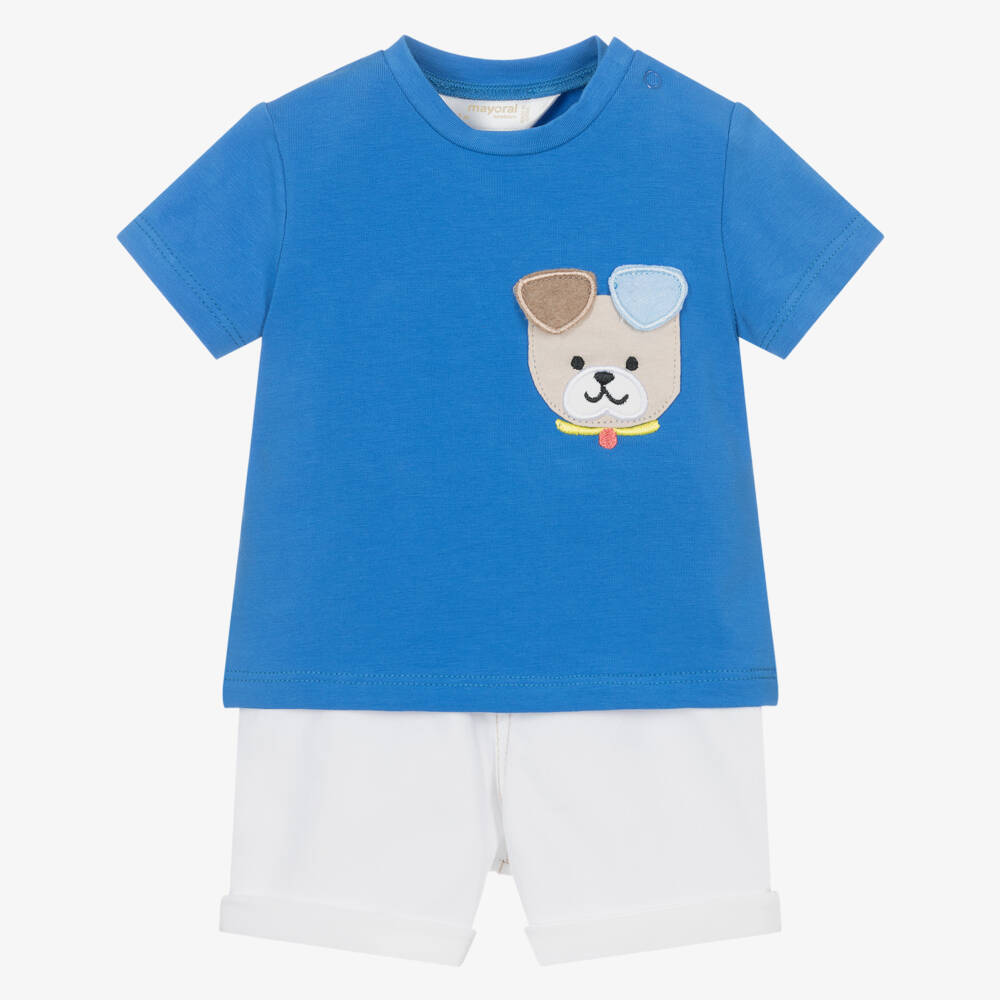 Blue and white cotton shorts set for baby boy by Mayoral. The soft jersey T-shirt has a cute puppy appliqué on the front, with shoulder poppers to help with dressing. Detailed with contrast stitching, the lightweight denim shorts have a gently elasticated waist and a decorative wooden button.