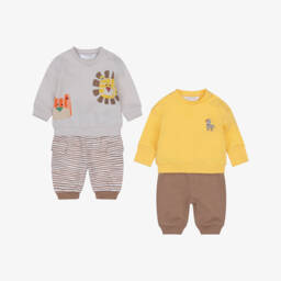 A pack of two tracksuits for baby boys by Mayoral, in ivory, blue and shades of green. The sweatshirts feature adorable frog and tortoise motifs and popper fastenings for easy dressing, while the joggers have a gently elasticated waistband and ribbed cuffs. Cute and casual, they are made in soft cotton jersey for comfort.