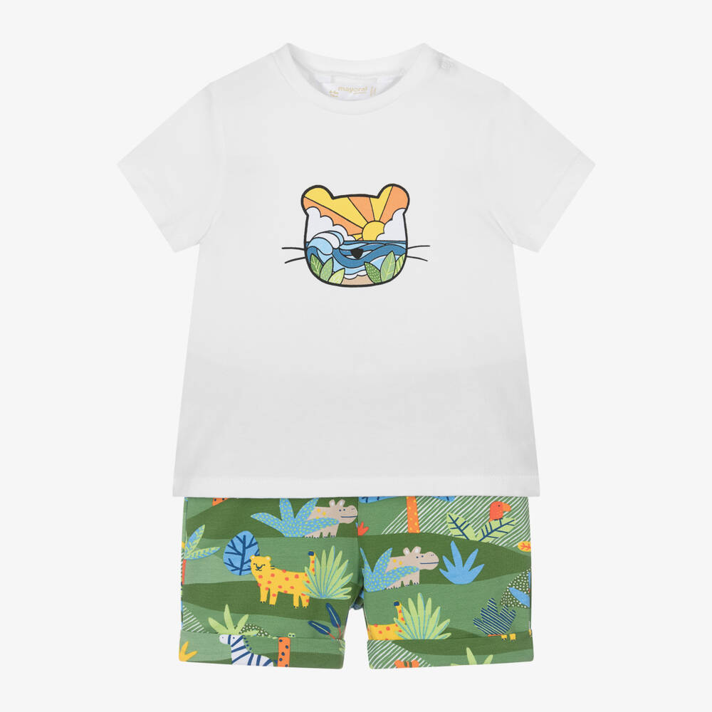 White T-shirt and green shorts set for baby boys from Mayoral, made in soft, stretchy cotton. The lightweight T-shirt has cute tiger face silhouette with a sunset scene, short sleeves, and easy-securing poppers on the shoulder. Patterned with friendly jungle animals, the mid-weight shorts will be comfortable and easy to slip on thanks to their elasticated waist.