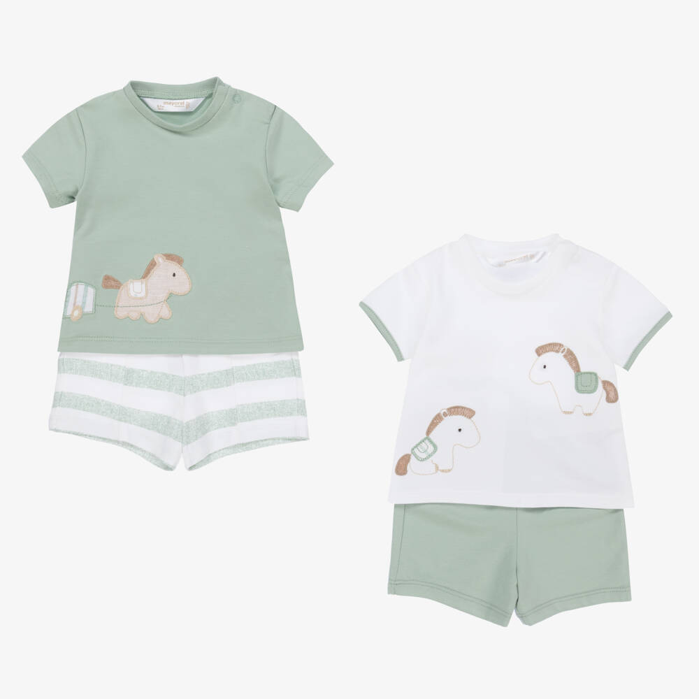 Pack of two green shorts sets for baby boys by Mayoral, made in soft sustainable cotton jersey. One outfit has two cute horses embroidered on the front of the T-shirt, and plain sage shorts. The other outfit has a horse and cart appliqué on the T-shirt, and striped sage green shorts. Both T-shirts fasten with poppers on one shoulder for ease when dressing. Mix and match each piece for versatile looks.