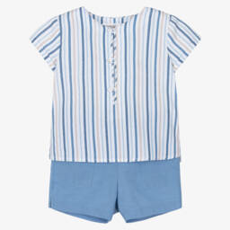Green striped shorts and T-shirt set for baby boys by Mayoral. The collarless top is made in soft cotton piqué, with a half button placket. The multicolour shorts are in a lightweight cotton and linen blend, with a comfortable stretchy waist and a wooden button fastening.