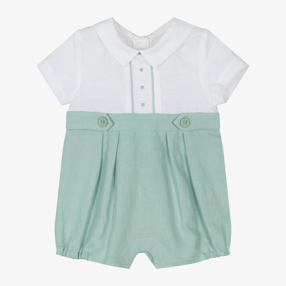 Jade green and white shortie for baby boys by Mayoral, made in a lightweight linen and cotton blend. Traditionally styled for a special occasion, it has a smart collar and a delicate green pattern stitched on the front. The fabric is gently pleated on the lower body and the legs are elasticated for a comfortable fit and feel. There are button fastenings on the back and poppers between the legs to help with quick nappy changes.