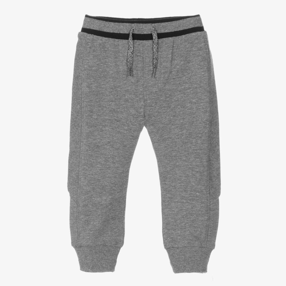 Marl grey joggers for baby boys by Mayoral Newborn, made in soft sustainable cotton sweatshirt jersey. They have a ribbed waistband with black stripes and a faux drawstring trim. There is a back patch pocket and the cuffs can be turned down.