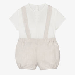 A sweet ivory and beige shorts set for baby boys by Mayoral, made in a lightweight blend of cotton and linen. Ideal for warmer days, the top has embroidered detailing on the front and button fastenings on the back. The accompanying beigeTop & shorts: 72% cotton, 28% linen (soft, lightweight) shorts are lined for comfort and styled with a gently elasticated waist and detachable shoulder straps.