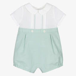 Smart ivory and green shortie for baby boys by Mayoral, made in a soft, lightweight cotton and linen blend. Styled to look like a separate shirt and shorts, this traditional one-piece has a Peter Pan collar, embroidered pleats and button detailing. There are button fastenings on the back with poppers between the legs, allowing for quick nappy changes.