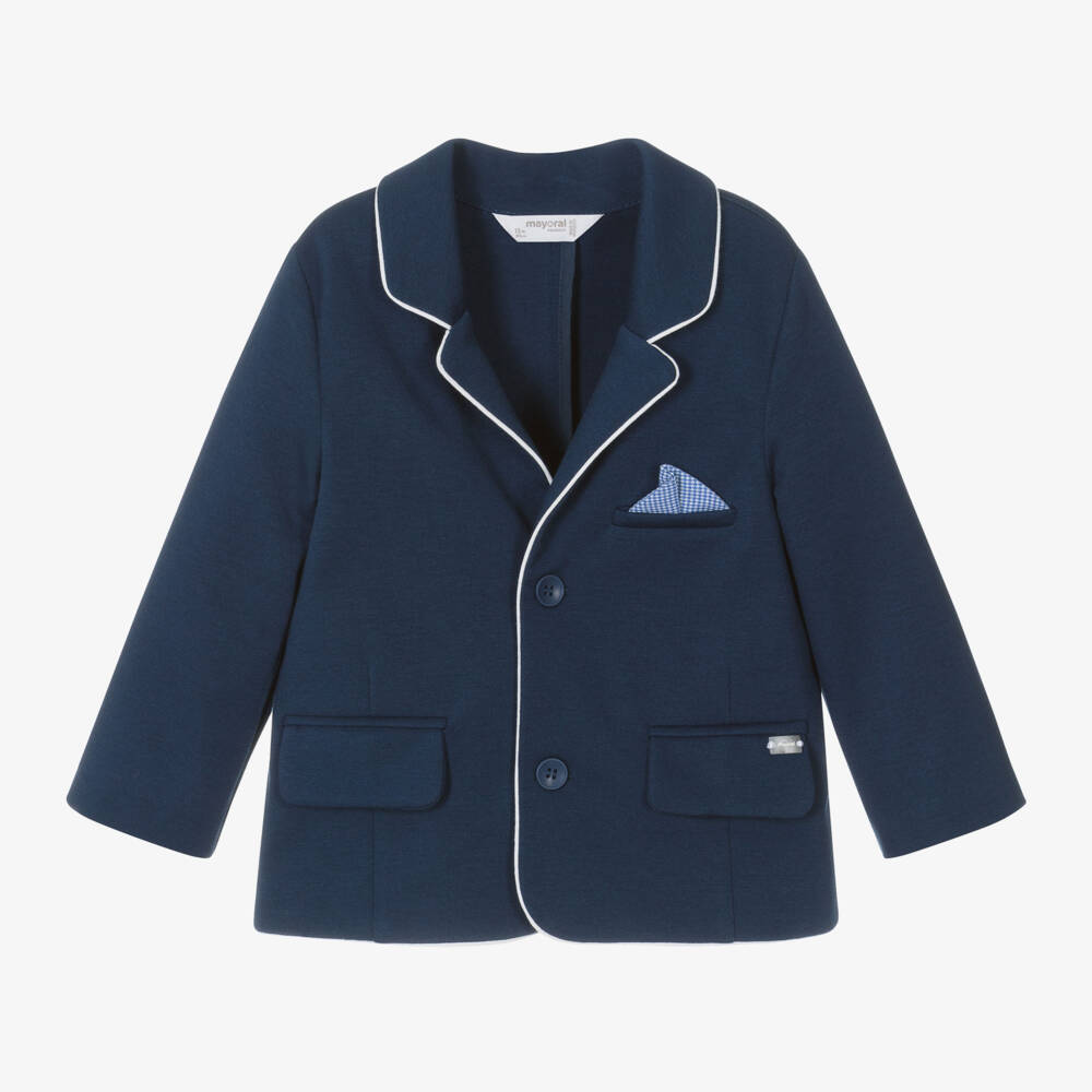 Navy blue blazer for baby boys from Mayoral Newborn, so comfortable in mid-weight cotton-blend jersey with a touch of linen. With smart, classic styling, it has notched lapels, an attached check pocket square detail, and single-breasted buttons to secure on the front. A subtle logo plate, white piping, and faux front pockets complete the look.