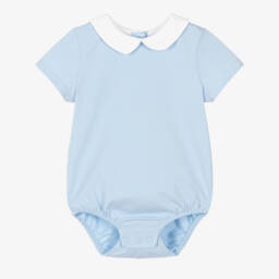Comfortable pale blue cotton bodysuit for baby boys from Mayoral, made in soft and stretchy jersey. It has a sweet collar with embroidered white detail and fastens with poppers on the back. The fastenings are adjustable between the legs for comfortable wear and easy nappy changes.