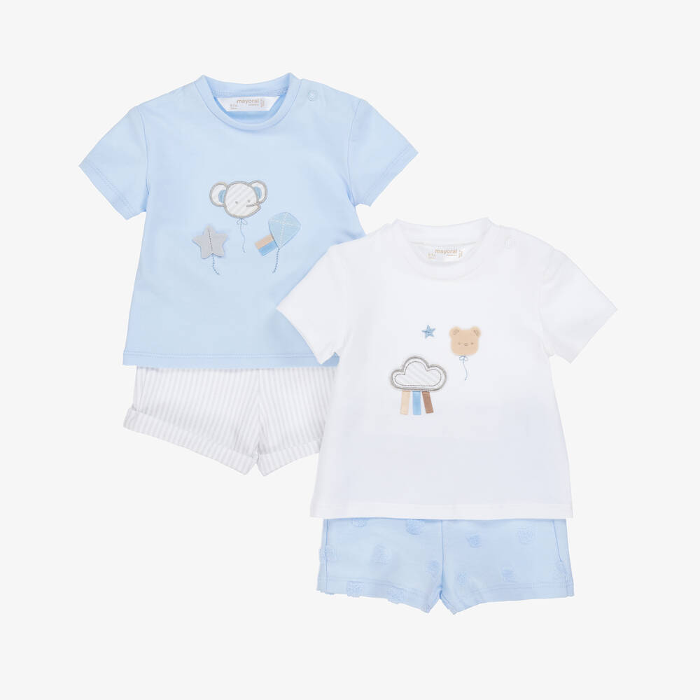 A pack of two, white and blue cotton shorts sets for baby boys by Mayoral, made in soft jersey. The T-shirts have cute bear and elephant themed designs with embroidered and appliqué details, and popper fastenings on one shoulder. One pair of shorts has a fine grey stripe and the other is plain blue with a terry bear motif for a textured finish.