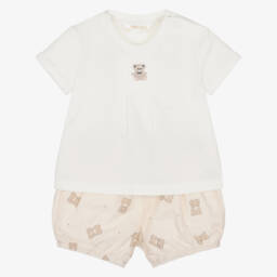White and blue shorts set for baby boys by Mayoral, made in soft cotton. The jersey T-shirt has a sweet embroidered elephant motif on the front and useful poppers on one shoulder to help with dressing. Fully lined for comfort, the woven shorts feature a cute elephant pattern and are gently elasticated around the waist and legs for a snug fit.