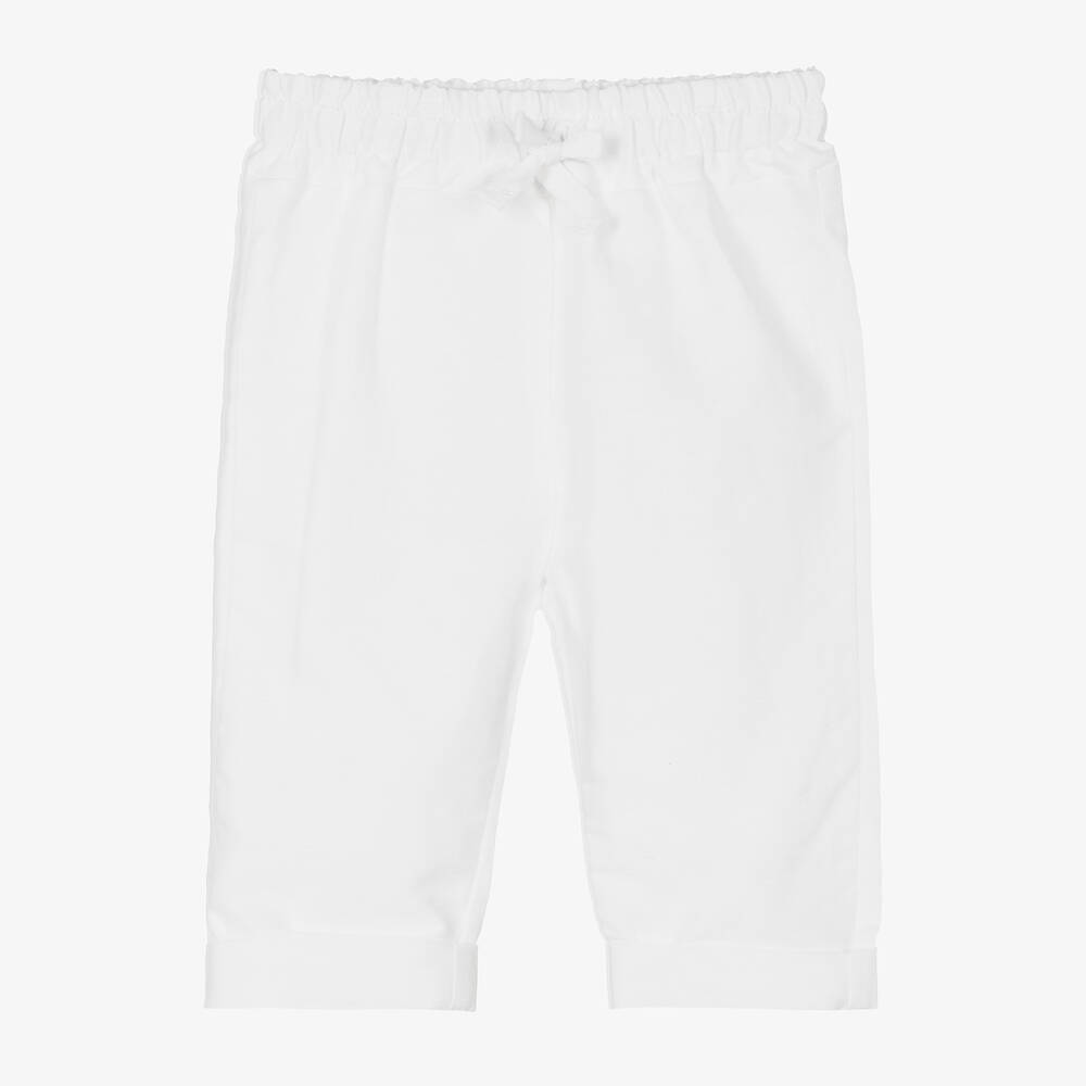White trousers for baby boys by Mayoral, made from a soft and lightweight cotton and linen blend. Casual and comfortable, they have sweet turn-up cuffs, faux pockets on the back and a gently elasticated waistband with decorative drawstring ties.