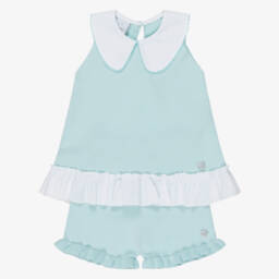 Summery mint green shorts set for baby boys by Mayoral, made in a cool, comfortable cotton and linen blend. The white shirt has decorative button and stitching detailing on the front, whilst the pull-on shorts have detachable, cross-over shoulder straps.