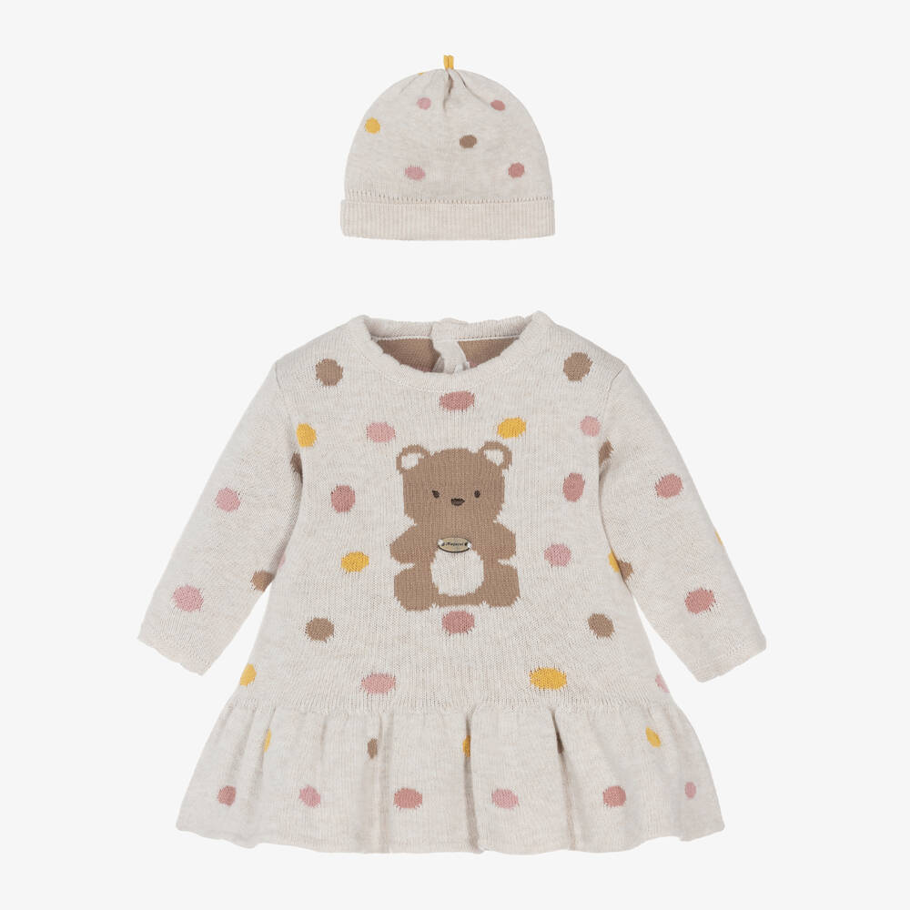 Ivory marl knitted cotton dress set for baby girls by Spanish brand Mayoral, with pink, yellow and beige dots. Soft and lightweight, it has a cute intarsia teddy bear on the front and scalloped cuffs. There is a deep, gathered hemline and it fastens with buttons on the back. The dress comes with a coordinating hat with a top knot and a ribbed brim.
