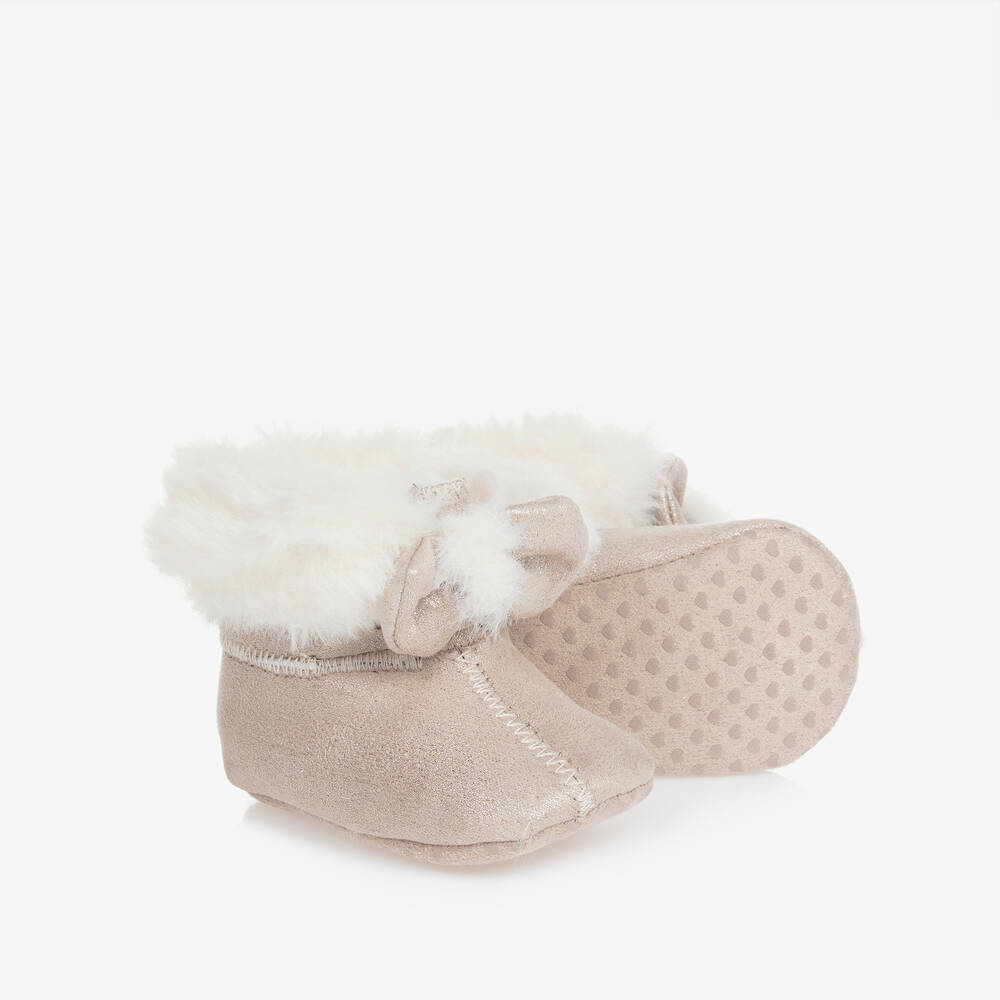 Beige sparkly pre-walker boots for baby girls by Mayoral, made from smooth faux leather. Super cosy, they have ivory faux fur trims and matching lining for extra comfort and warmth. Decorated with a bow on the front, they fasten with velcro on the back and have a rubberised heart pattern on the flexible textile outsole.