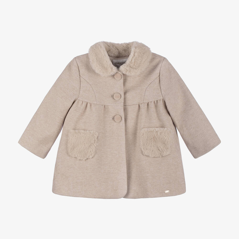 Traditional beige trapeze coat for baby girls by Mayoral Newborn, lined in beautifully soft plush. Lovely for keeping little ones warm on colder days, it is made in a soft viscose-blend fabric with a brushed feel. There are velvet-covered button fastenings on the front for a classic style. A fluffy plush collar and adorable plush pockets complete the look.
