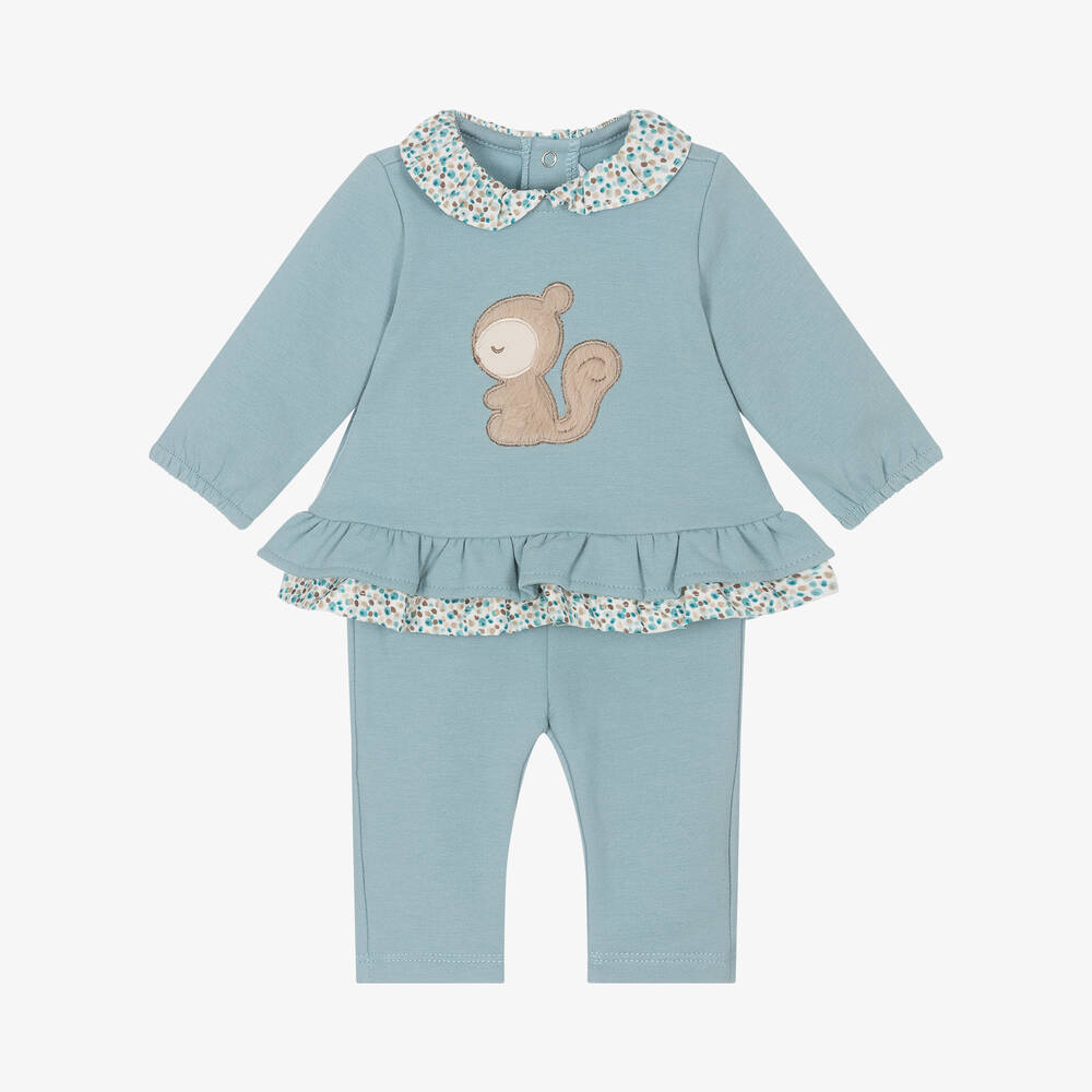 Dusky blue leggings set for baby girls by Mayoral, made in comfortable cotton jersey. With a double-layer look, the top has beige dot-print trims, dainty ruffles, and a fluffy squirrel appliqué on the front. It fastens with easy-to-secure poppers on the back. The elasticated waist on the leggings ensure they are quick and simple to pull on.
