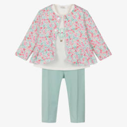 A sweet mint green leggings set for baby girls by Mayoral, made in soft cotton jersey. The leggings are seamed down the front and have a gently elasticated waist. The white T-shirt has capped sleeves and a charming hot air balloon motif on the front. The set is completed with a popper-fastening cardigan, featuring a delicate peplum hem and a pretty floral pattern.