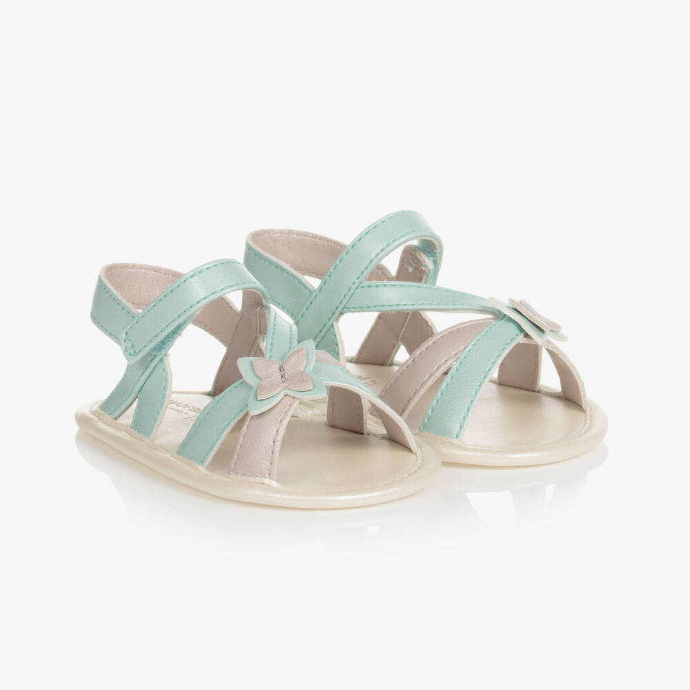 Pretty aqua green pre-walker sandals for baby girls by Mayoral, made in soft and flexible pearlescent faux leather. They have a pale beige accent and cute butterfly appliqué on the criss cross straps. The insole and outsole are in a lovely pearlescent ivory. They fasten easily with velcro strap at the ankle.