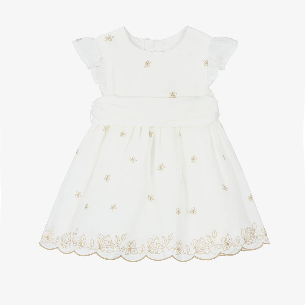 Lovely for a special occasion, an ivory chiffon dress for baby girls by Mayoral. Beautifully decorated with beige floral embroidery, it has elegant flutter sleeves and a detachable belt around the waist. The skirt has a pretty scalloped hemline, with a voile underskirt and a tulle-trimmed lining for extra volume. Zip fastening on the back, the dress comes with a pair of white knickers.