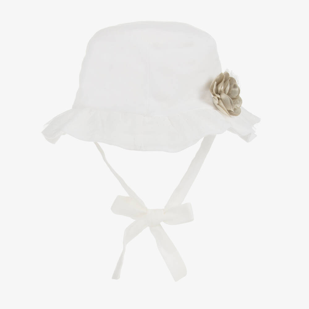 Pale ivory sun hat for baby girls by Mayoral, made in soft and comfortable cotton. It has a pretty silver-beige flower decoration on the front and a sparkly tulle trim around the brim. This sweet hat secures under the chin with ties.