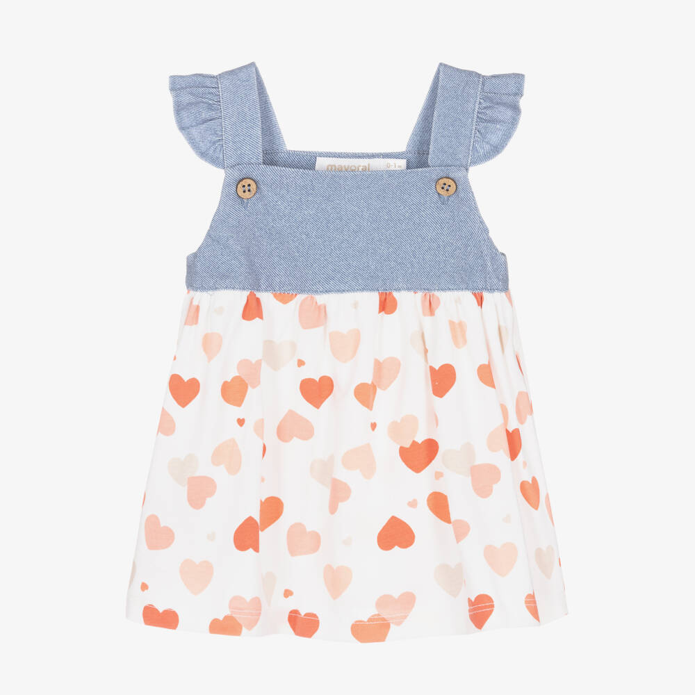A pretty ivory pinafore dress for baby girls by Mayoral, made from soft cotton jersey. In a timeless design, it has a vibrant heart print below the waist in tones of pink and beige. The denim-look jersey shoulder straps are trimmed with sweet frills and can be fastened with wooden buttons on the bib front.