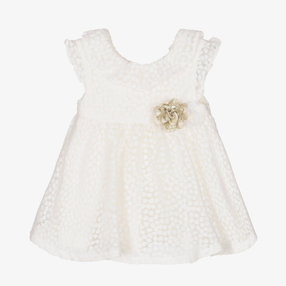 Beautiful ivory dress for baby girls by Spanish brand Mayoral, made in a sheer viscose blend organza with a soft voile lining. Lovely for a special occasion, it has a pretty ruffled collar, a gold flower appliqué and delicate frilled sleeves. There is a concealed zip fastening on the back. This dress comes with matching knickers, which have a grosgrain bow on the elasticated waistband.