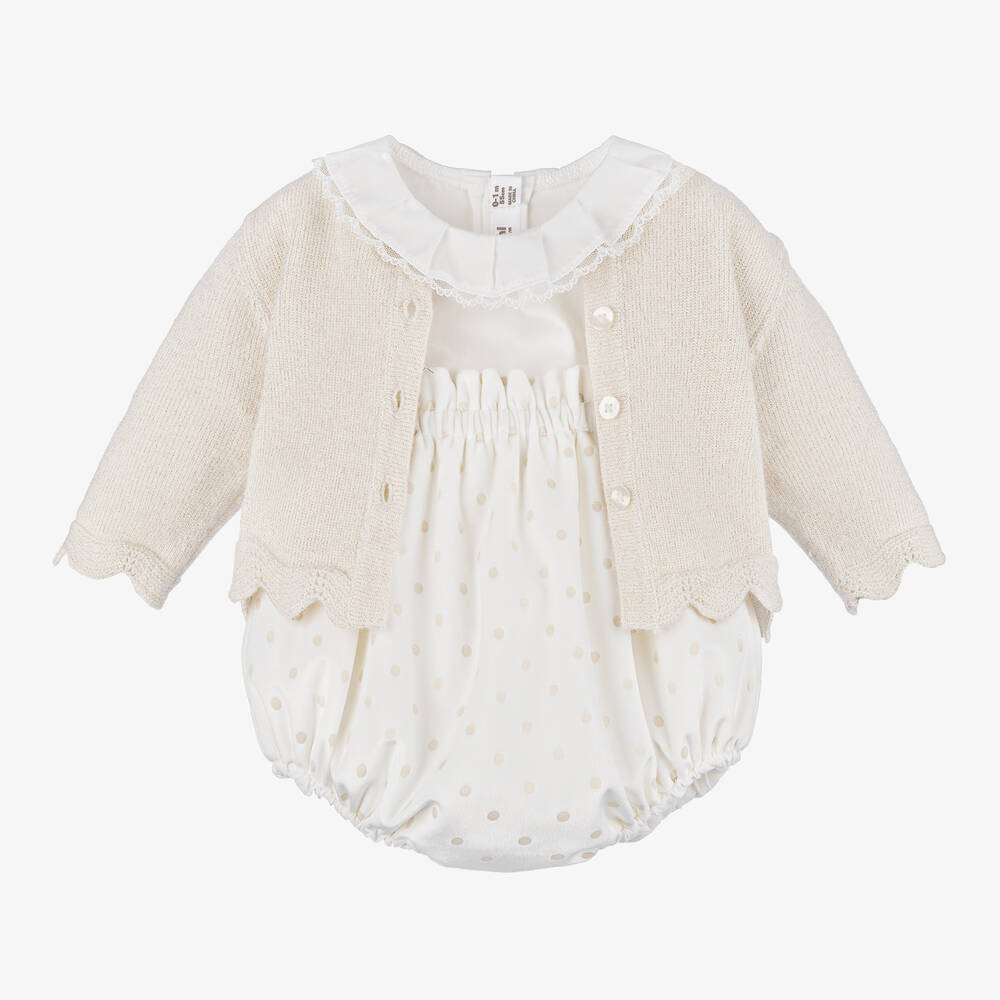 Ivory and beige shorts set for baby girls by Mayoral. Made in a soft knit, the viscose-mix shimmery gold cardigan has lovely scalloped edges and pearlescent buttons on the front. The blouse, in lightweight cotton poplin, has a beautiful ruffle collar with a lace trim. The cuffs are elasticated and the back secures with buttons. With a sweet dotted pattern, the cotton-lined velvet shorts have elasticated trims and adjustable, button-fastening shoulder straps.