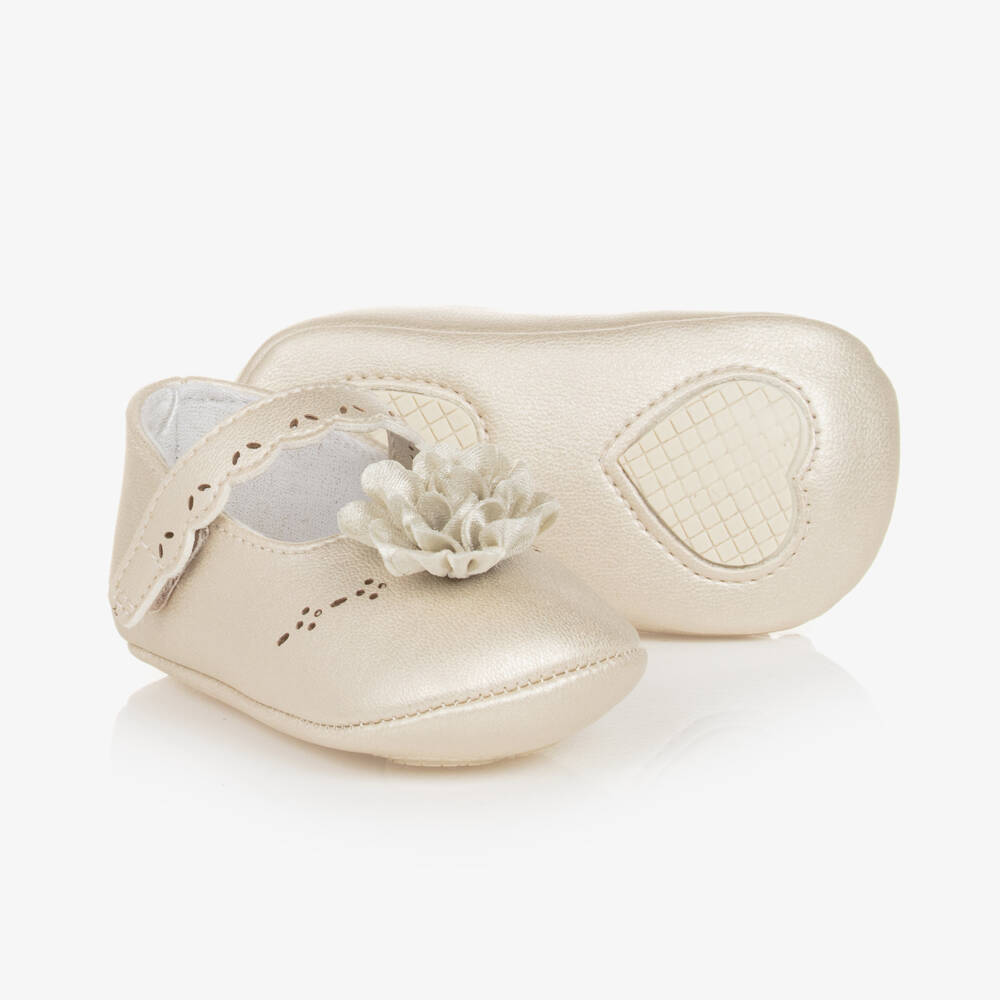 Light beige pre-walker shoes for baby girls by Mayoral, made from soft and supple faux leather. Ideal for special occasions, these pretty shoes have velcro fastening straps and 3D fabric flower appliqués on the front. They have a soft cotton lining and a flexible, lightweight outer sole with non-slip rubber pads.