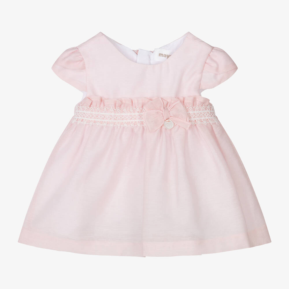 A charming pale pink dress for baby girls by Mayoral, ideal for special occasions. Romantic and charming, it has layered short sleeves and a frill on the front detailed with crochet lace and a sweet bow. Made from smooth semi-sheer fabric with lightweight lining, it fastens with a concealed zip on the back. A pair of matching knickers complete the pretty outfit.