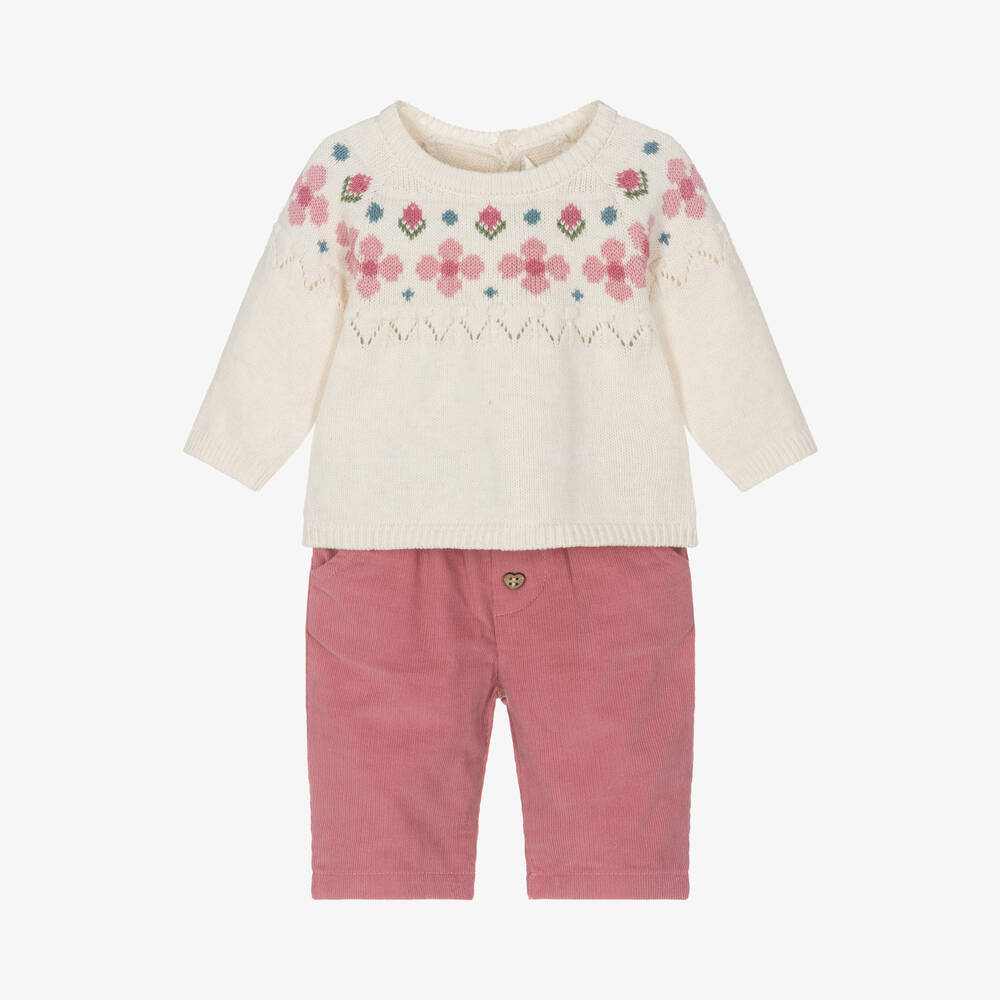 Pretty pink trouser set for baby girls by Spanish brand Mayoral, just right for cooler days. The knitted, ivory, cotton blend sweater has a beautiful, Fair Isle style floral pattern around the shoulders, with sweet, knitted bobble and open stitch detailing below. It fastens on the back with buttons. The pink cotton corduroy trousers have a frilled, elasticated waistband, ideal for little tummies. On the front are decorative, heart-shaped buttons and slanted pockets.