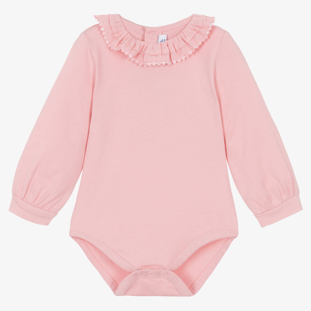 A delightful pink cotton bodysuit for baby girls by Mayoral, made in comfortable, stretchy jersey. It has a frilled, tiered collar with a pretty, heart-shaped, embroidered trim. There are popper fastenings on the back and between the legs, so it always stays neatly tucked in.