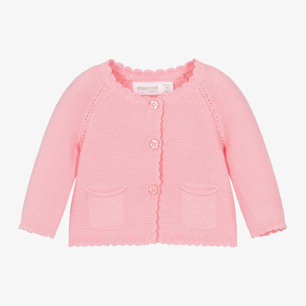 A delightful pink cardigan for baby girls by Mayoral, made from a soft cotton knit. Pretty and girly, it has long sleeves, sweet scalloped trims and little pockets on the front. It fastens with pearlescent pink buttons for a lovely finish.