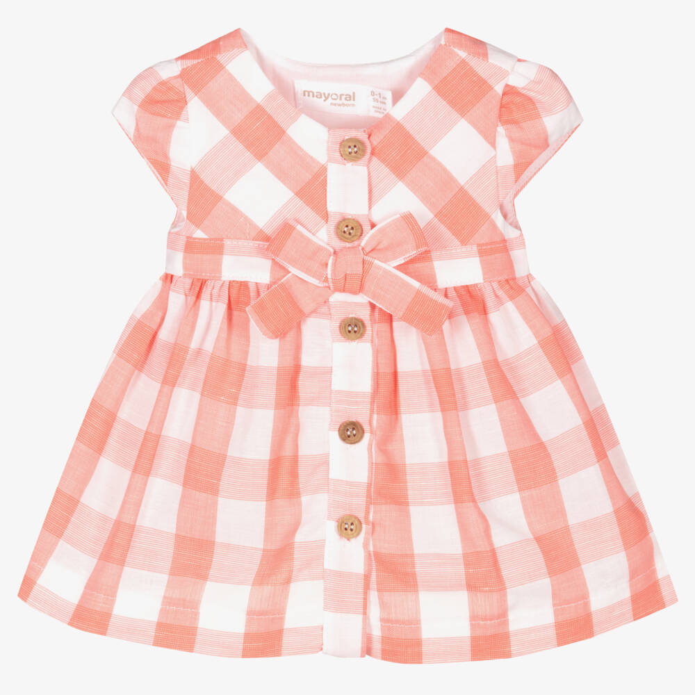 Pretty pink and white checked dress set for baby girls by Mayoral Newborn, made in a lightweight blend of cotton and linen. The dress has cap sleeves, a bow trim on the front and wooden effect button fastenings on the front. Matching knickers complete the set.