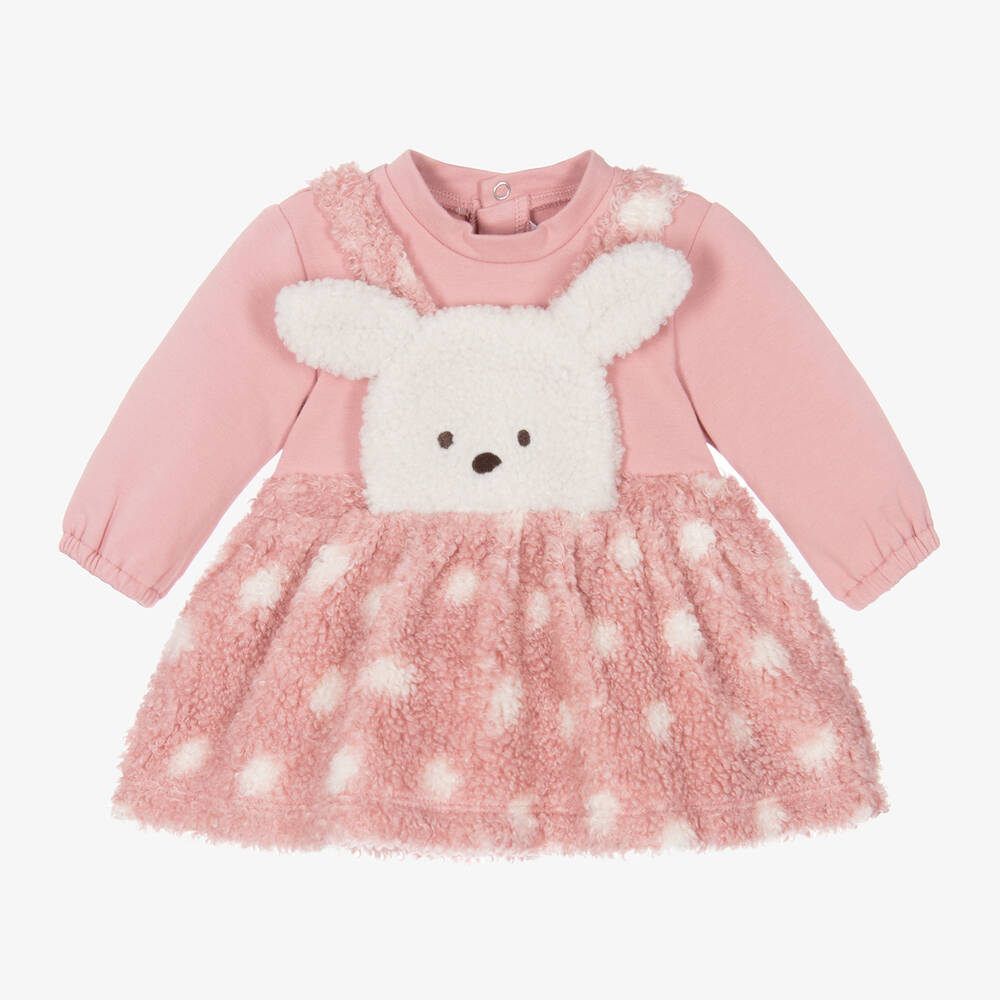 Super cute cotton-blend pink dress for baby girls by Spanish brand Mayoral, with the look of a two piece. The soft jersey 'top' has long sleeves with gently elasticated cuffs. The 'pinafore dress' is made in faux shearling, with a sweet lamb and 3D ears on the bib, a gathered skirt with ivory polka dots and a comfortable jersey lining. The dress fastens with poppers around the back.