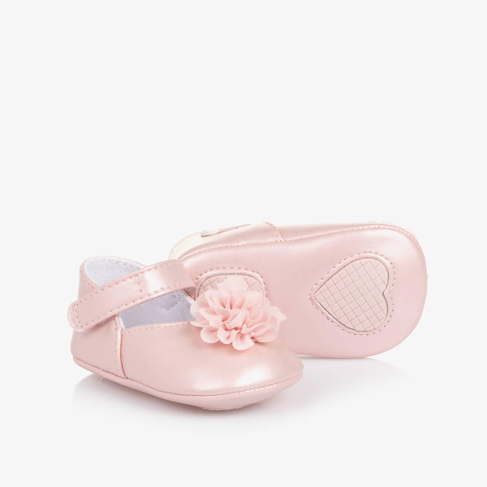 Beautiful pearl pink pre-walker ballerina pumps for baby girls by Mayoral. Made in smooth faux leather, these flexible shoes have a shimmery effect with a pretty chiffon flower decorating the toe. Fastening easily with a velcro strap, they have a soft textile lining for comfort and rubberised grips on the outsole.