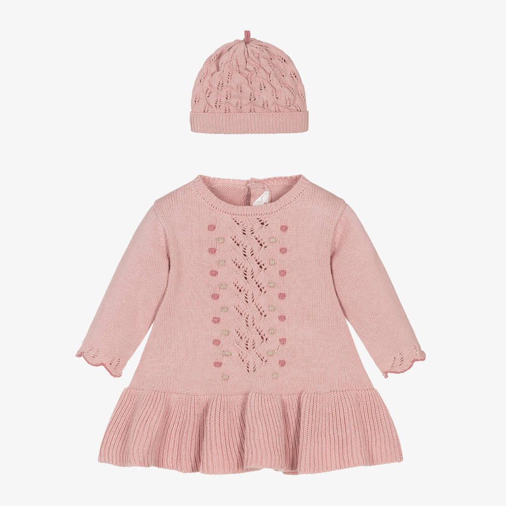 Pale pink dress set for baby girls by Mayoral, in a soft cotton knit. It has pretty, open work detailing with embroidered pink and green bobbles on the front. There is a deep, frilly, ribbed hemline and tonal buttons on the back. The dress comes with a coordinating hat with pink loops on the top and a ribbed brim.