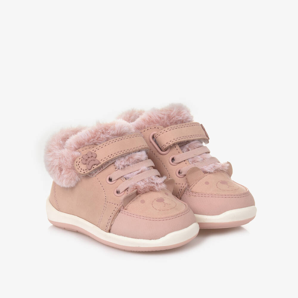Adorable, pink first walker shoes for baby girls by Mayoral, made in soft suede leather with pretty faux fur trim and a cute bear face on the toe. Fully lined with soft leather, they have removable, antibacterial and ergonomic insoles for optimum comfort. The reinforced heel and toe, along with the non-slip rubber sole, provide extra support when taking those first steps. Elasticated laces allow for easy slip-on and a velcro strap provides a secure fit.