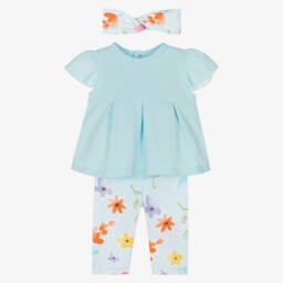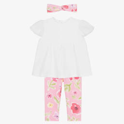 Delightful white and pink leggings set for baby girls by Mayoral, made from soft cotton jersey for comfort. The top has pretty, puffed voile sleeves with delicate embroidered trim and fastens with poppers on the back. The pink leggings have a vibrant floral pattern with an elasticated waistband for a comfortable fit. A matching headband completes the cute look.