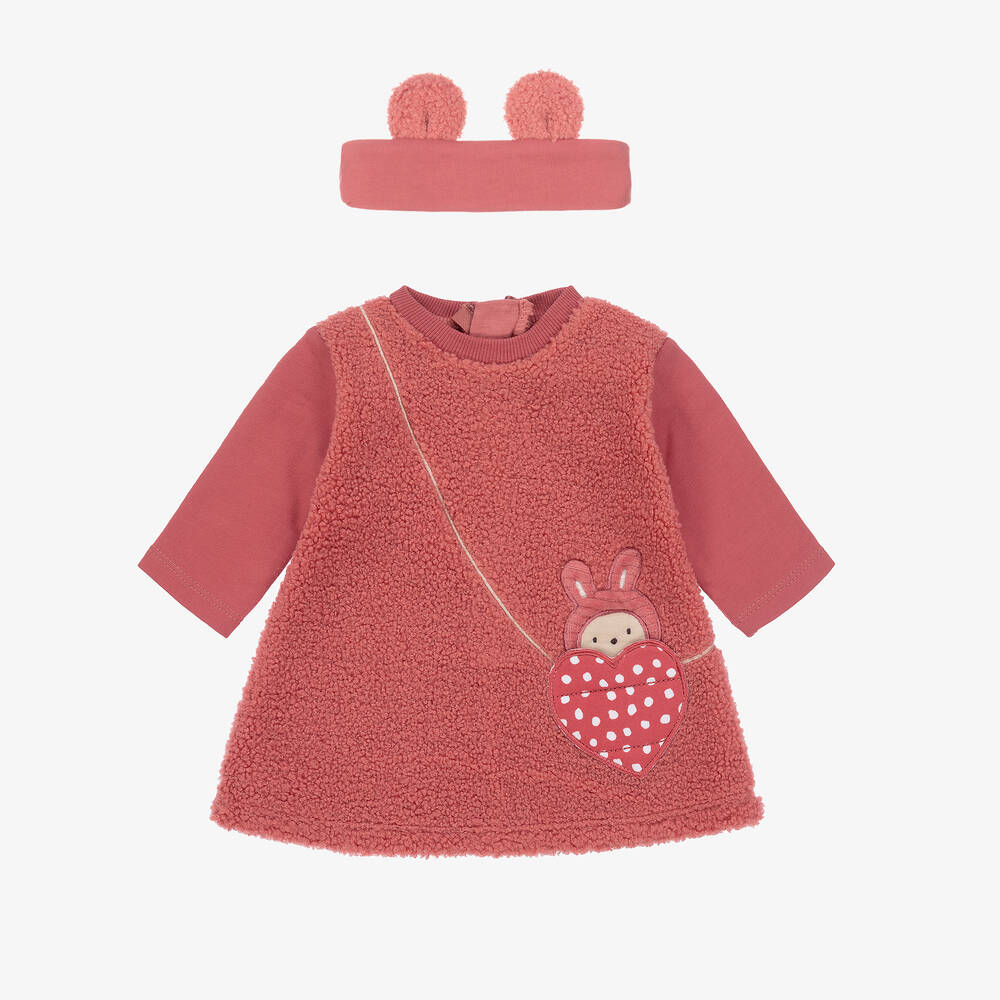 Pretty pink dress set for baby girls by Mayoral, made in soft cotton blend jersey and sherpa for comfort. The dress has a quilted heart-shaped pocket over a sweet bunny motif for a sweet finish. A concealed zip fastening on the back makes dressing quick and easy. It comes with a matching headband with 3D sherpa ears for an adorable coordinated look.
