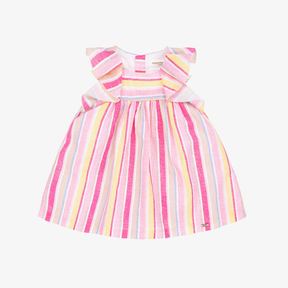 Lovely for warmer days, a pretty Mayoral dress for baby girls, striped in shades of pink, beige and yellow. Made in a lightweight linen and cotton blend, this sleeveless style has pretty ruffles over the shoulders for a charming look. The dress is comfortably lined in cotton voile, fastens with buttons on the back and comes with matching knickers to complete the adorable look.